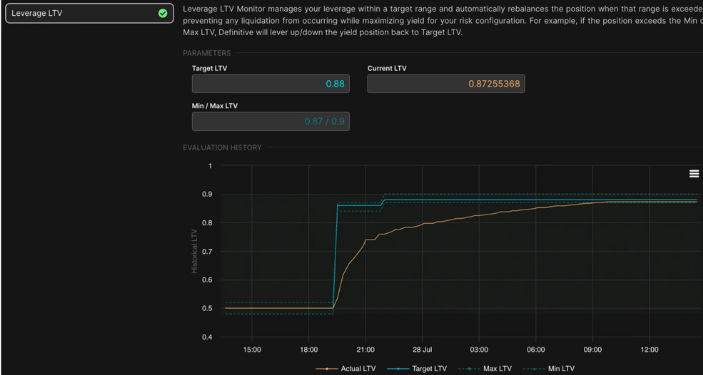 To mitigate this risk, Definitive’s Leverage LTV Monitor ensures leverage stays within a target range and automatically rebalances the position when that range is breached, preventing any liquidation from occurring while maximizing yield for the client's risk configuration. For example, if the position exceeds the minimum or maximum LTV, Definitive will lever up/down the yield position back to the target LTV.